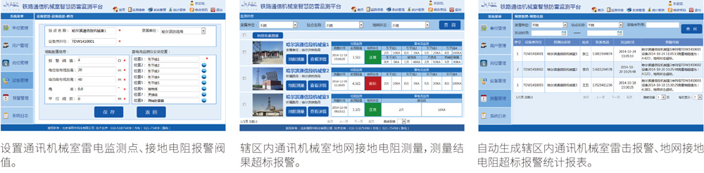 防雷大数据云平台,能够为铁路电务系统通讯机械室提供各种以防雷数据为基础的应用服务,例如通讯机械室各监测点雷击报警,地网接地电阻超标报警、接地电阻值变化趋势等,指导设备维护人员进行设备维护,节约运维成本、提高检修效率。