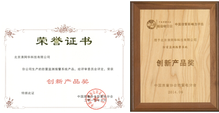 年会同期还举行了“第三届中国防雷影响力评选颁奖典礼”,向荣获殊荣的行业影响力人物、创新产品、优质工程颁奖。北京清网华科技有限公司自主研发制造的“防雷监测报警系统”产品,经评审委员会评定,荣获创新产品奖。